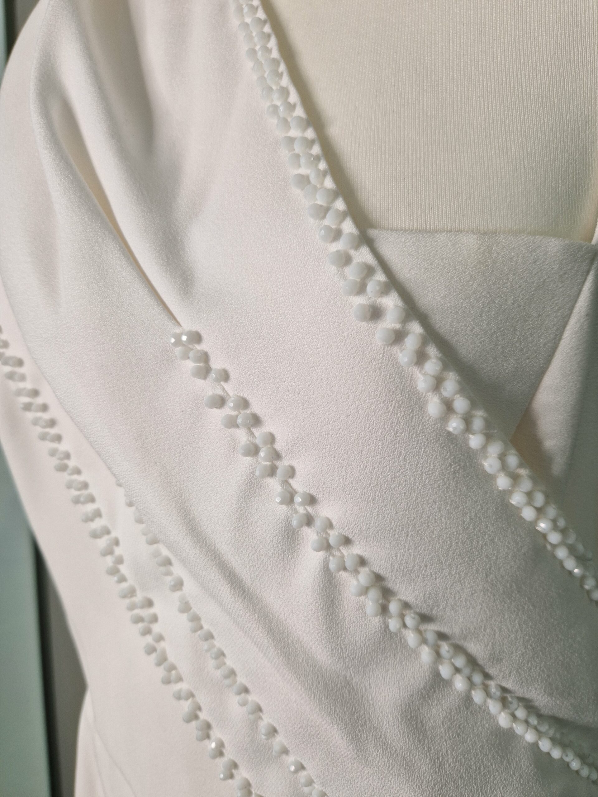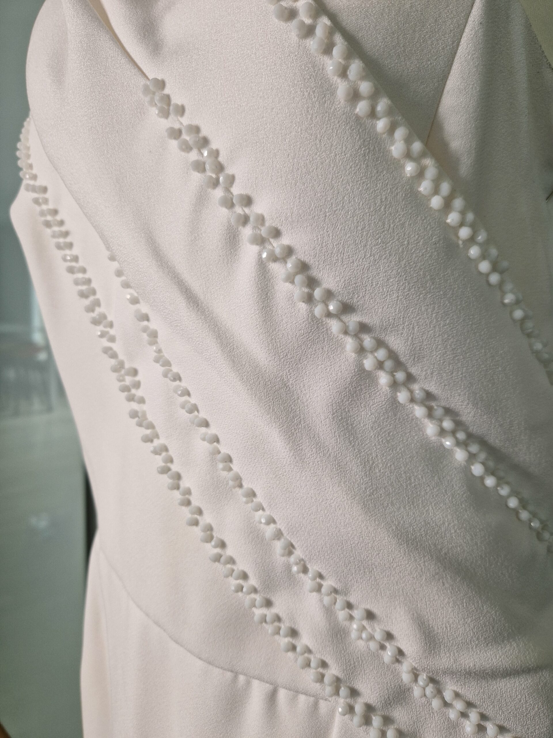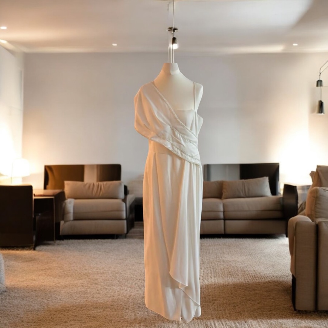 (Lune Blanche)…Illuminez vos soirées avec cette somptueuse robe blanche. Avec son tissu soyeux, son drapé élégant et ses subtiles perles scintillantes, cette création capture l’essence de la féminité et de l’élégance. Parfaite pour un cocktail, une cérémonie ou une occasion spéciale, vous serez vous l’étoile de la soirée.